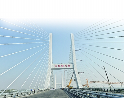 扬子晚报记者昨天在雨花台区的扬子江大道南延段的最北头看到,河中央两座H形的主塔已经高高竖立了起来。主塔上,42对粗壮的钢索呈斜拉状向两边分散排列。走近发现,大桥已在进行伸缩缝、装路灯等最后的收尾施工。